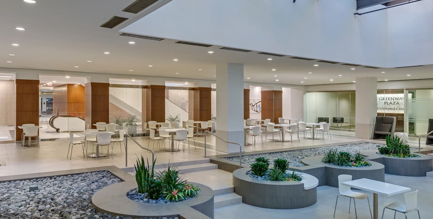 Greenway Plaza Food Court and Fitness Center Houston, Texas LocationHouston, Texas ClientCousins Properties Contract Value$2,600,000 Square Feet43,000 Year CompletedMay 2016 Schedule20 weeks Key PartnersZiegler Cooper Architects Project TypesOfficeHouston LocationHouston, Texas ClientCousins Properties Contract Value$2,600,000 Square Feet43,000 Year CompletedMay 2016 Schedule20 weeks Key PartnersZiegler Cooper Architects Project TypesOfficeHouston Overview This project was the renovation of the existing food court and fitness center in 3 Greenway Plaza. The 43,000-sf renovation of an existing food court included audiovisual equipment, sign bands, planter details, decorative tile, and landscaping. Our team replaced the existing pavers and setting bed with new large-scale porcelain tile laid over a waterproof membrane. Through constant communication and teamwork, we achieved the client’s initial goal to renovate the existing food court while allowing the space to remain fully operational during construction. HITT also converted an abandoned, 11,500-sf theater into a fitness center. Key features of the project include graphic designs painted by a commissioned artist. Through constant communication and teamwork, our team achieved the architect’s initial design concept to leave the existing CMU walls and open structure allowing the space to have an industrial feel. We upgraded the locker room to give the area a high-end spa feeling. This helped attract members from the business community.
