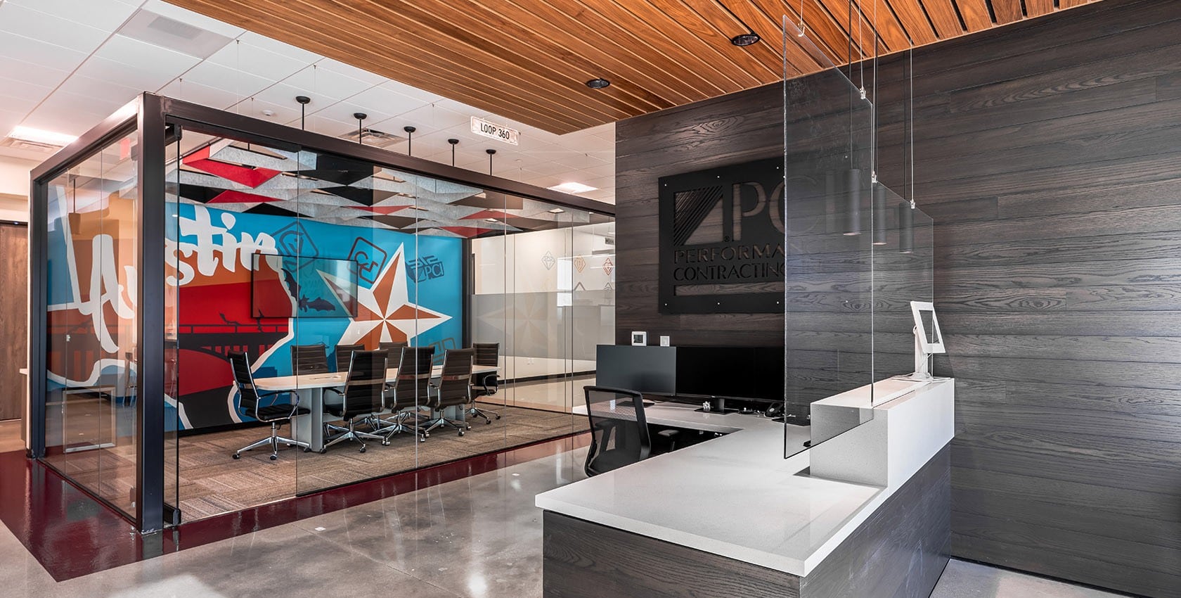 PCI Austin, Texas LocationAustin, Texas ClientPCI Contract Value$680,000 Square Feet12,500 Year Completed2020 Schedule21 weeks Key PartnersLink ArchitectureStream Realty Partners Project TypesOfficeRenovationsTenant Fit-outs LocationAustin, Texas ClientPCI Contract Value$680,000 Square Feet12,500 Year Completed2020 Schedule21 weeks Key PartnersLink ArchitectureStream Realty Partners Project TypesOfficeRenovationsTenant Fit-outs LocationAustin, Texas ClientPCI Contract Value$680,000 Square Feet12,500 Year Completed2020 Schedule21 weeks Key PartnersLink ArchitectureStream Realty Partners Project TypesOfficeRenovationsTenant Fit-outs Overview This 12,500 sf office interior renovation including working spaces, conference rooms, bathroom, break room, and a full-service warehouse completed within a 21-week timeline. The warehouse acts as a training and assembly space with modular elements that allow the warehouse to transform into an entertaining venue for PCI’s clients. High-racking and wide lanes made the warehouse functional for storage and forklifts. The offices and storage rooms were strategically placed in the warehouse to keep this space open and operational. The space was transformed by the creative elements added in the way of branded wall-coverings, a graffiti mural, and even special elements like PCI maroon stained concrete.