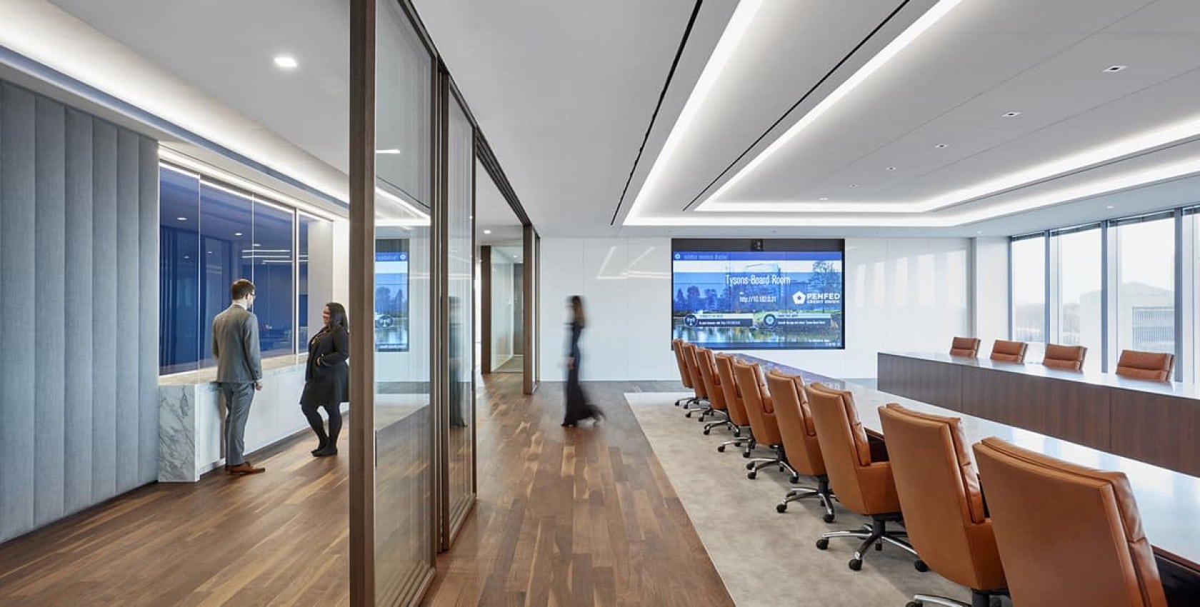Pentagon Federal Credit Union McLean, Virginia LocationMcLean, Virginia ClientPentagon Federal Credit Union Contract Value$16,000,000 Square Feet140,000 Year CompletedOctober 2016 Schedule20 weeks Key PartnersGensler WSP Engineering Project TypesOfficeWashington, DC Awards & CertificationsWBC Craftsmanship Award for Architectural Millwork, 2016 LocationMcLean, Virginia ClientPentagon Federal Credit Union Contract Value$16,000,000 Square Feet140,000 Year CompletedOctober 2016 Schedule20 weeks Key PartnersGensler WSP Engineering Project TypesOfficeWashington, DC Awards & CertificationsWBC Craftsmanship Award for Architectural Millwork, 2016 LocationMcLean, Virginia ClientPentagon Federal Credit Union Contract Value$16,000,000 Square Feet140,000 Year CompletedOctober 2016 Schedule20 weeks Key PartnersGensler WSP Engineering Project TypesOfficeWashington, DC Awards & CertificationsWBC Craftsmanship Award for Architectural Millwork, 2016 Overview This project is a complete new 100,000-sf headquarters build-out in Tysons. The build-out consisted of a new credit union bank branch on the first floor and 98,000 sf of office space on floors 8–11. The executive suite on the 11th floor features law firm-type finishes including walnut wood flooring and Calcutta-cladded elevator walls and reception desk. Another project highlight is the walnut veneer-wrapped communicating stairway between the 11th floor executive suite and 10th floor. The project features a 70-foot-long executive boardroom with a full-height glass Addotta wall leading to an interior catering kitchen. Unique to this space are the 10-foot-high glass partitions throughout the 10th and 11th floors, increasing natural light. You might be interested in... Appian Headquarters LMI